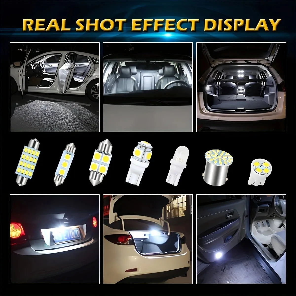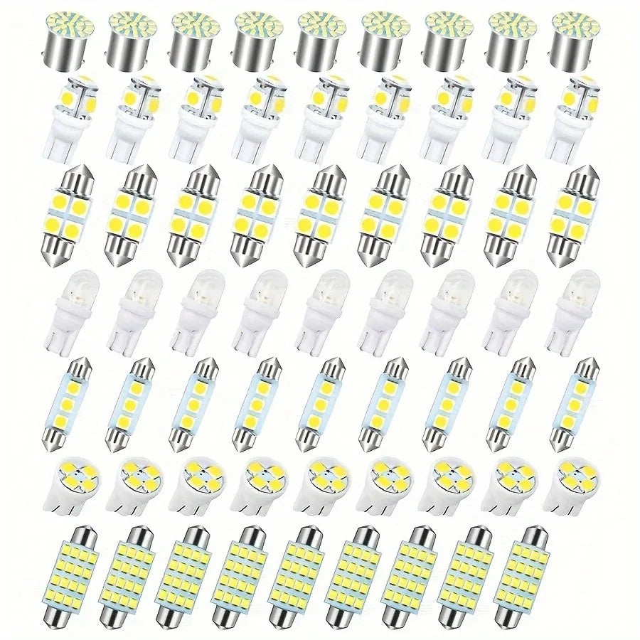Kombinasjonssett med lysende hvite LED-bilbelysninger for interiør, tilgjengelig i 42, 14, 28 eller 63 stk – tilbyr overlegen 6000K-lysning ved 12V for kart- og taklys, med energioptimalisering og enkel installasjon.